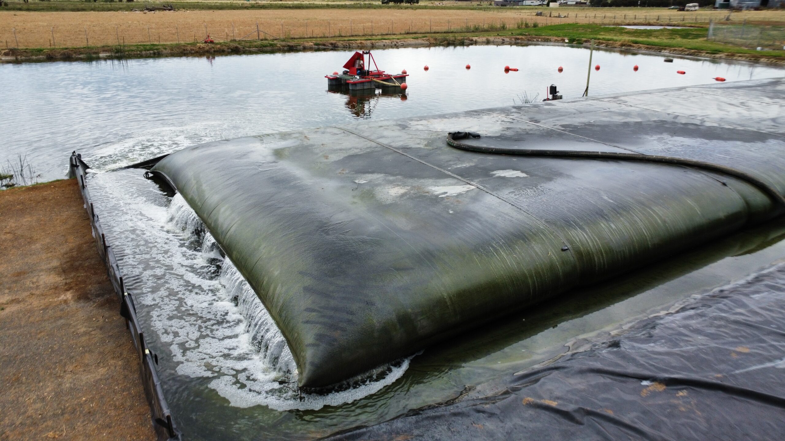 An unmanned floating pontoon dredge, operated via a cable and winch system, was used to extract the biosolids from the pond. During pumping, the material was dosed with polymer and directed into the GeoTubes, where it was dewatered to a spadable consistency. The dewatered biosolids were then transported to a local farm and spread for beneficial reuse.