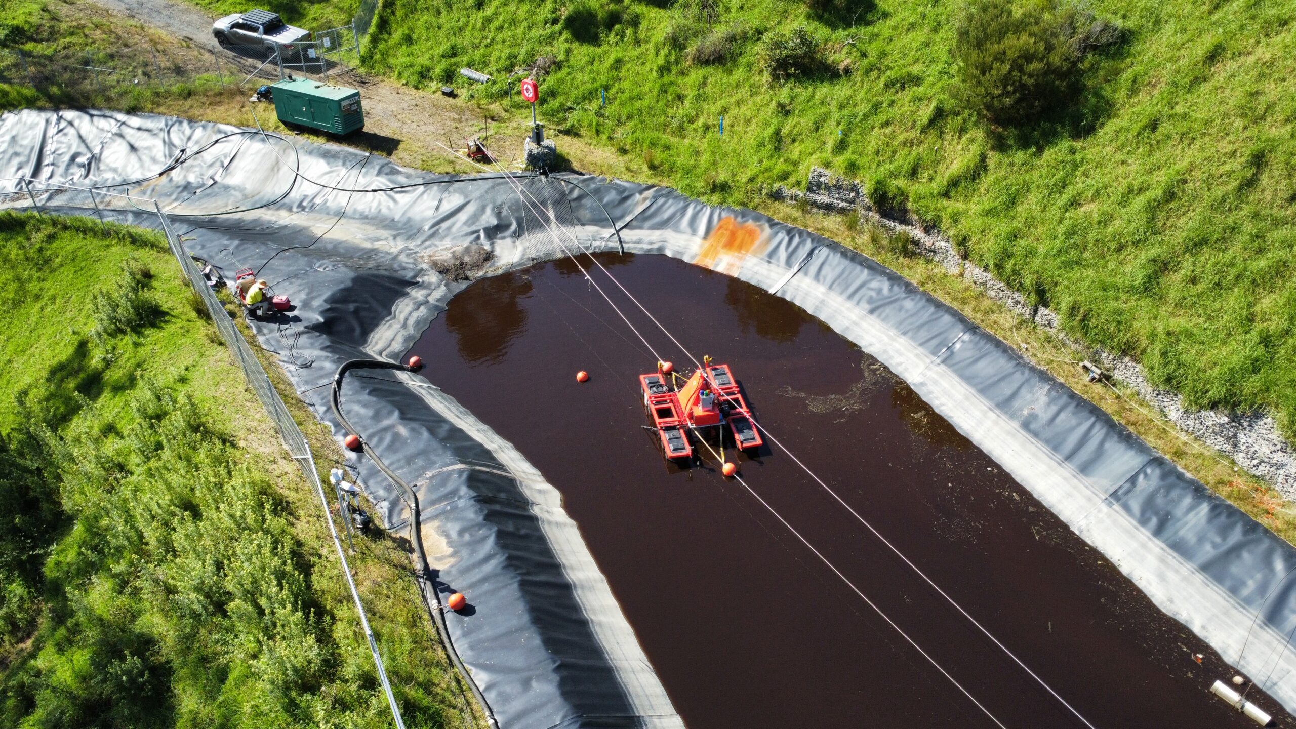 An unmanned floating pontoon dredge, operated via a cable and winch system, was used to extract silt and sediment from a polyethylene lined dam. The material was dosed with polymer during pumping into a GeoTube, where it was dewatered prior to disposal.